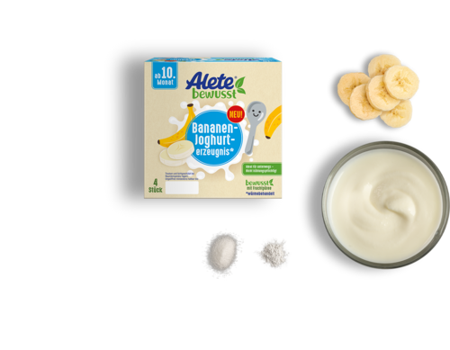 - Jetzt schichte in die Gläschen: die Hälfte eines Alete bewusst Bananenjoghurt, dann etwas Erdbeerpüree und nun die zweite Hälfte des Alete bewusst Bananenjoghurts